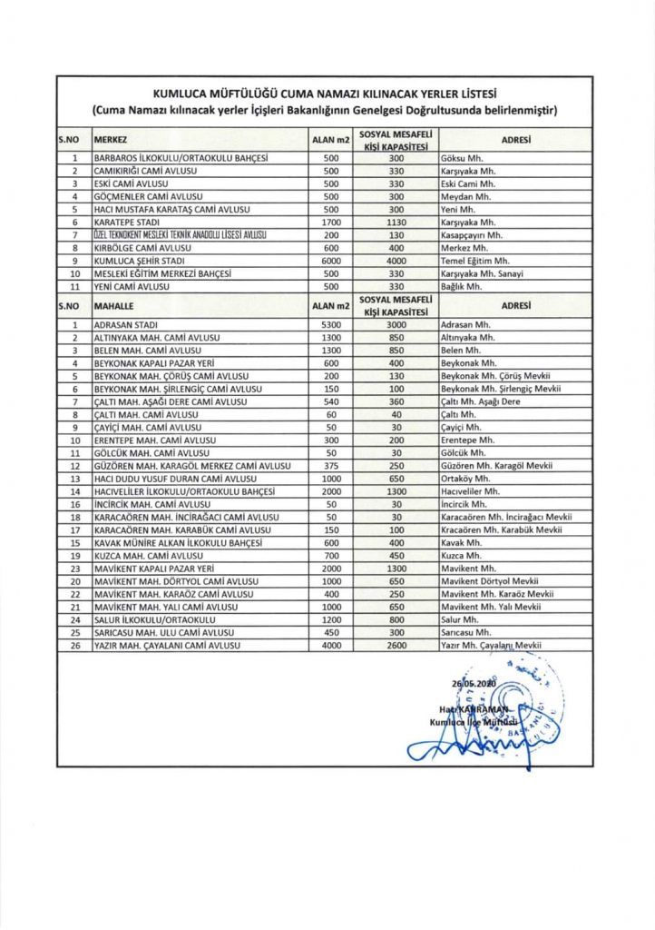 Kumluca müftülüğünün yaptığı yazılı açıklamada Cuma namazı kılınacak yerler alta görülen listeye göre olacaktır.
