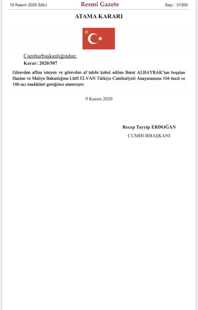 Cumhurbaşkanı Kararı ile Hazine ve Maliye Bakanlığı görevine Lütfi Elvan atandı.