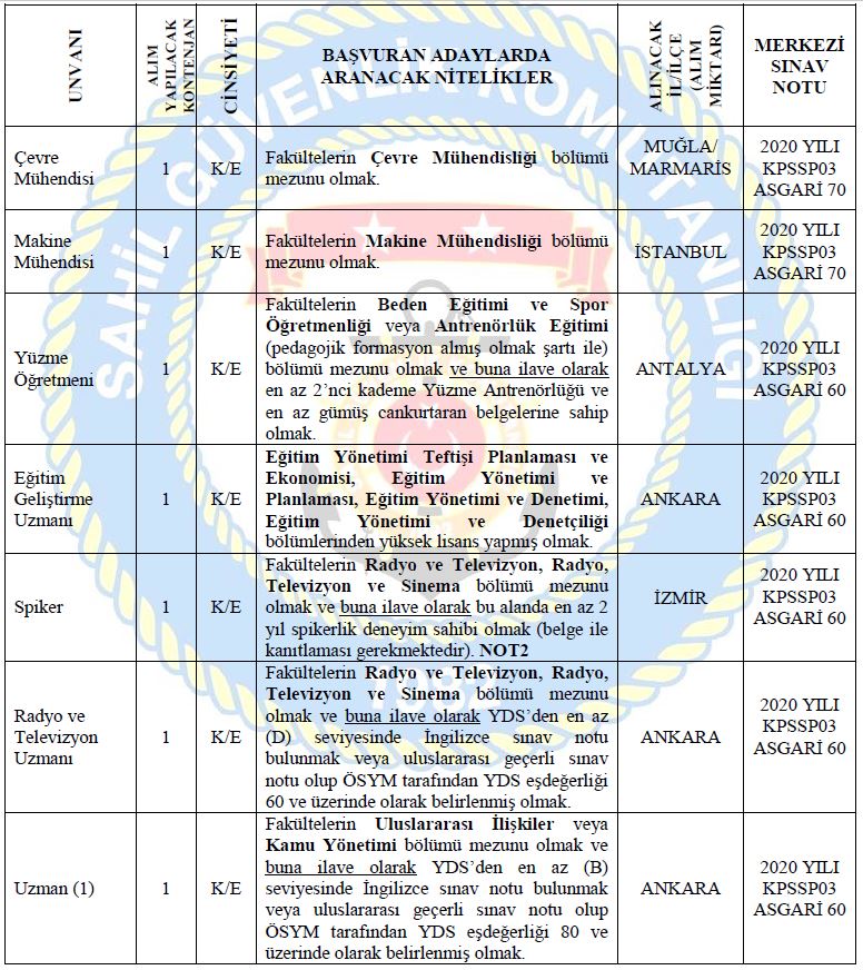 1. Sahil Güvenlik Komutanlığında istihdam edilmek üzere “Jandarma Genel Komutanlığı ve Sahil Güvenlik Komutanlığında İlk Defa Devlet Memurluğuna Atanacaklar İçin Yapılacak Sınavlar Hakkında Yönetmelik” hükümleri doğrultusunda 657 sayılı Devlet Memurları Kanunu’na tabi olarak aşağıda durumları açıklanan unvanlardan açıktan atama yoluyla devlet memuru alımı yapılacaktır.