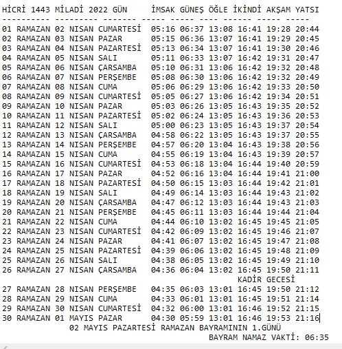 2022 YILLI CUMHURBAŞKANLIĞI DİYANET İŞLERİ BAŞKANLIĞININ BELİRLEMİŞ OLDUĞU RAMAZAN AYI İMSAKİYESİ BELLİ OLDU .